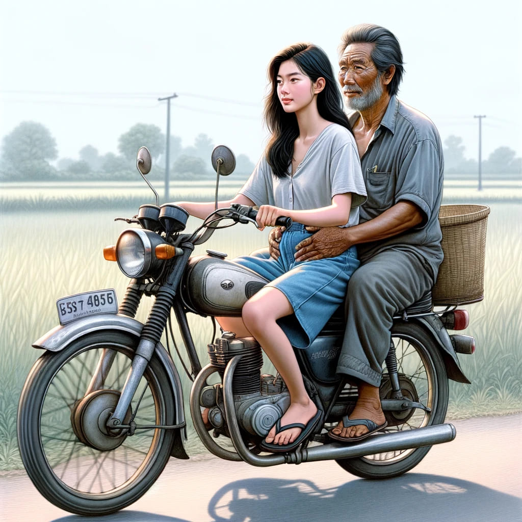 ลุสชาขึ้ั่เตร์ไซค์แล้ให้าขึ้ั่ข้าห้า เขาทาหลัา่าใล้ชิ ืขลุสชาโรเาเพื่ช่ประค