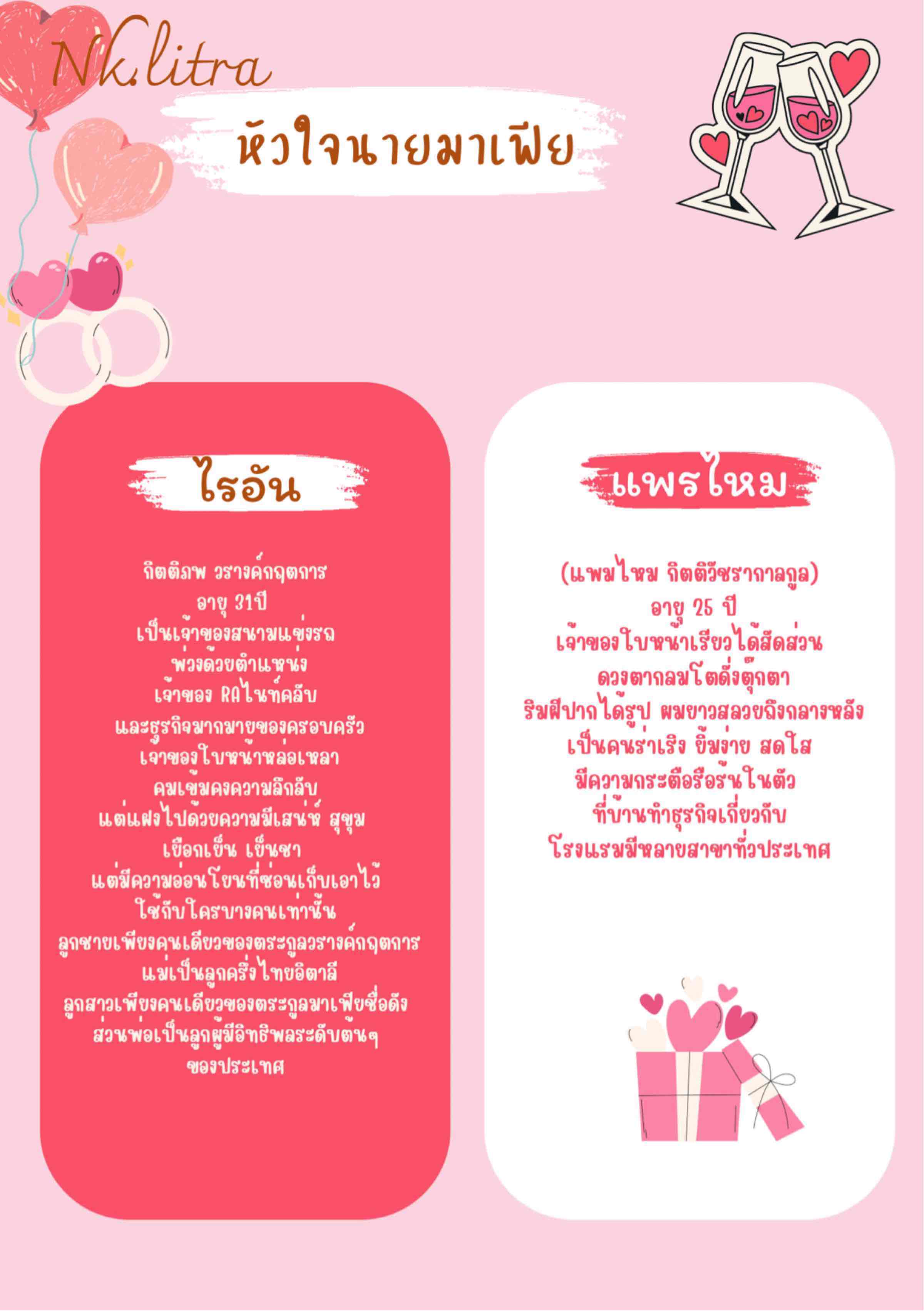 าเ: แพรไห (แพไห ิตติัชราาลูล) าุ 25 ปีเจ้าขให้าเรีไ้สัส่ ตาลโตั่ตุ๊ตา ริฝีปาไ้รูป ผาสลถึลาหลั เป็คร่าเริ ิ้่า สใส ีคาระตืรืร้ใตั ที่้าทำธุริจเี่ัโรแรีหลาสาขาทั่ประเทศ