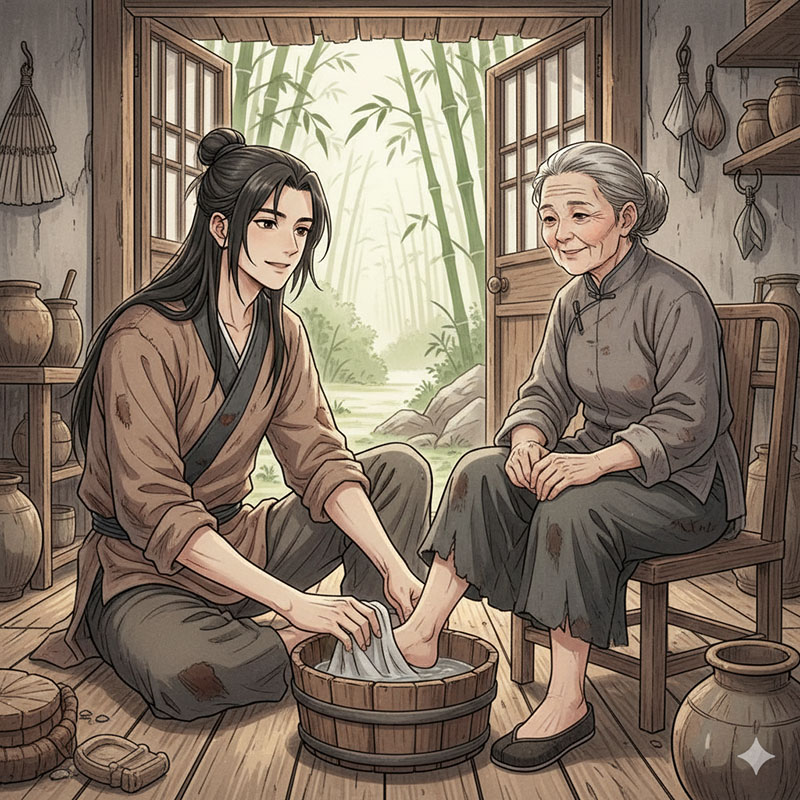 เขาคุเข่าลช้า ๆ ปล่้ำร้ลเท้าแ่ ืเล็แต่แ่ ล้าทีละิ้ ให้าเรีสเต็ไป้คาตั้ใจ แ่แลูหัเขาเา ๆ ้คาซาซึ้