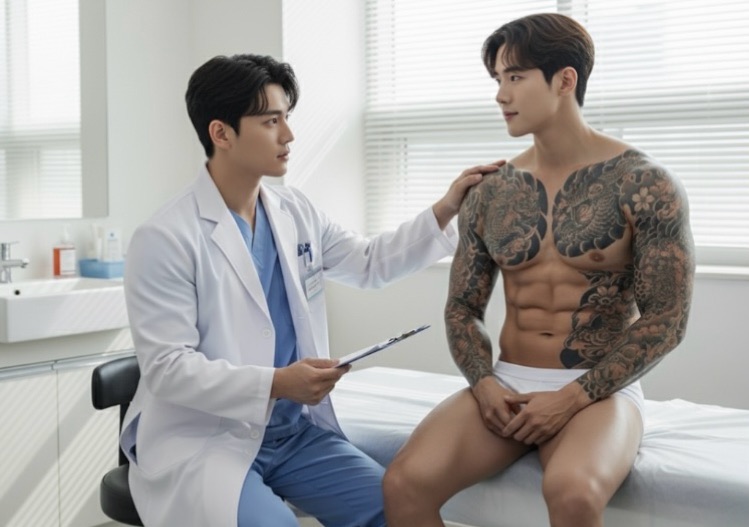 เขาหัไป เจชาหุ่รุ่้ ตัสู ห้าิ้ แตาซ ไ้ผ้เิ ปลาระขึ้เหืโลตี แขเสื้เปิพัขึ้เห็รสัลาราฟิโผล่าิหึ่