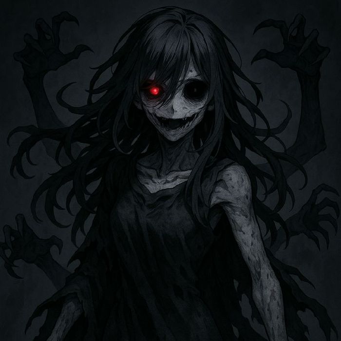 ทุกคนมองตามที่มันชี้ ก็เห็นร่างที่ยืนอยู่บนต้นไม้ เป็นผู้หญิง สวมเสื้อสีขาว ผมยาวปิดบังใบหน้า แต่เห็นดวงตาสีแดงฉาน ลอดผ่านเส้นผมที่ปิดบังใบหน้าออกมา