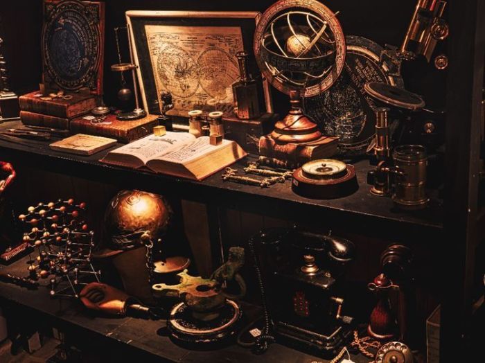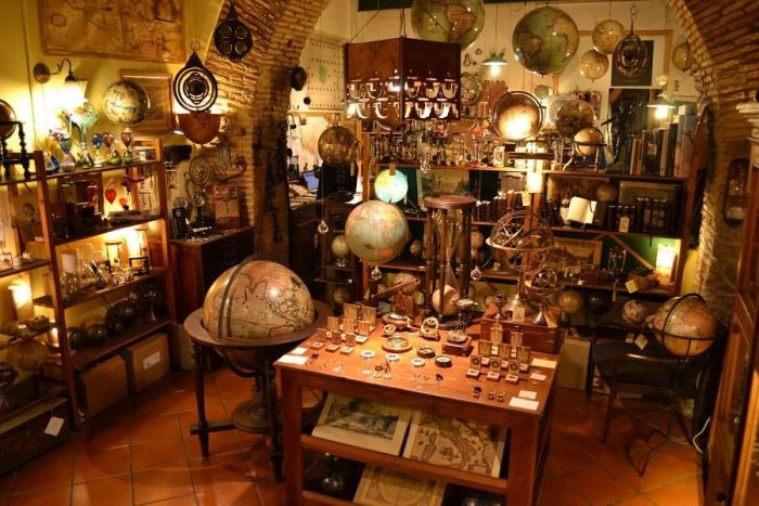 ด้านในเต็มไปด้วยของเก่าเต็มร้าน ทั้งนาฬิกาเก่า เครื่องประดับเก่า กล่องดนตรีพัง ๆ