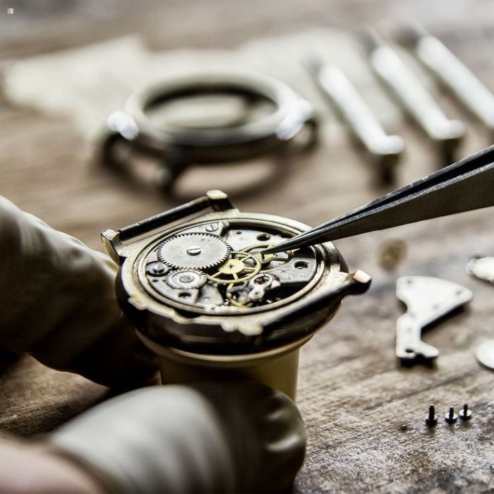 นั่งก้มหน้าซ่อมนาฬิกาพกอย่างใจเย็น มือของเขาขยับอย่างนุ่มนวล แต่ชำนาญ