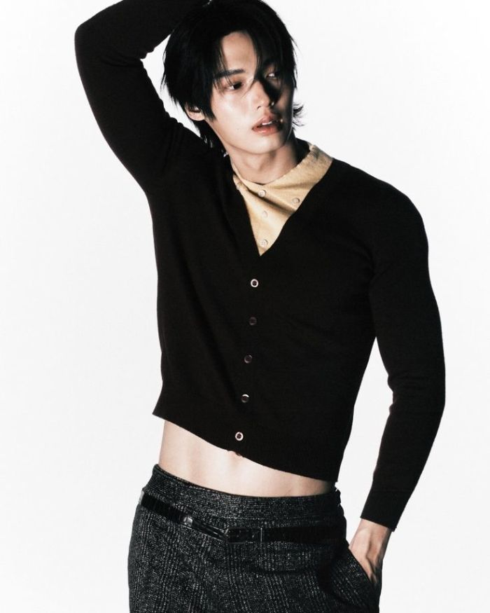 ด้วยเสื้อเชิ้ตสีขาวปลดกระดุมสองเม็ด คลุมด้วยแจ็กเก็ตดีไซน์แปลกตา