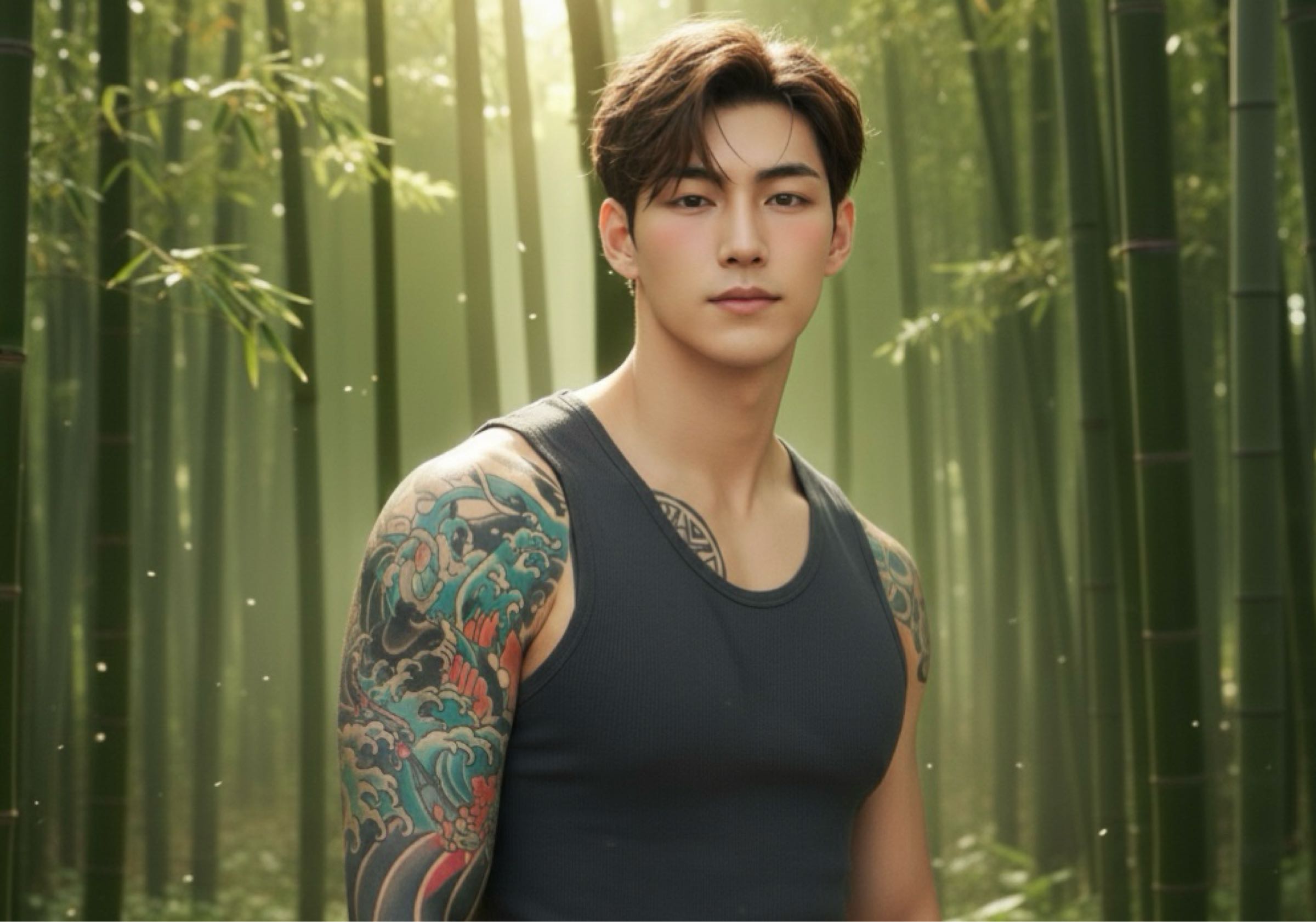 เสื้ล้าสีเข้แตัเปีเหื่ าเผ้ารัต้ขา ลาสัญี่ปุ่โรัแขซ้าเหืัรำลัเลื้ขึ้จาล้า