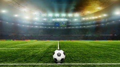 สนามฟุตบอลในยามเย็นถูกล้อมด้วยแสงไฟสีขาวนวลจากเสาไฟสูง เสียงลูกบอลกระทบพื้นดังเป็นจังหวะสม่ำเสมอ