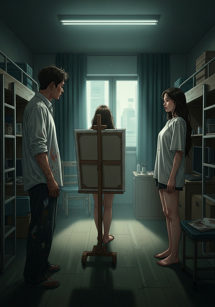 เฆำลัาภาพ เาใเรืห ซึ่เป็ภาพสะท้ขคาเหาและคาปรารถาที่ถูปิั้ เขาจ้เรืร่าขปราฝ่าตั้ใจ แต่สาตาขเขาัเริ่ไ่ใช่ใฐาะศิลปิีต่ไป