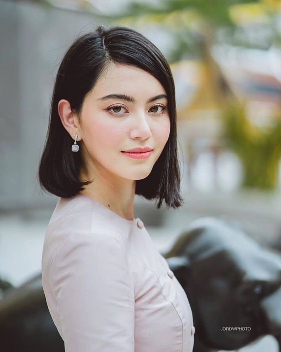เสื้อสีขาวแขนพับถึงข้อศอก เอี๊ยมสีครีมผูกโบว์ด้านหลัง เส้นผมนุ่มสีเข้มตกลงมาปิดข้างแก้มเล็กน้อย