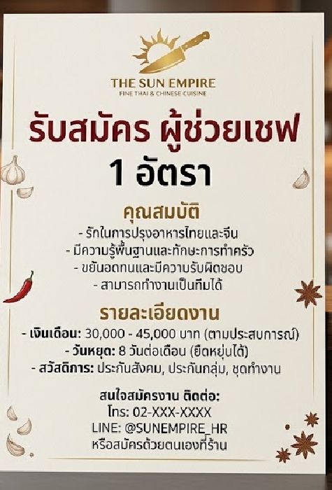 "รัสัครผู้ช่เชฟ 1 ัตรา... ร้าาหาร 'The Sun Empire'..." โปรพึพำัตัเ ให้าหาูจริจัขึ้าทัที ี่คืโาสที่เขาจะไ้ทำาใร้าาหารระัหรู และพัฒาฝีืารทำาหารไท-จีที่เขารั
