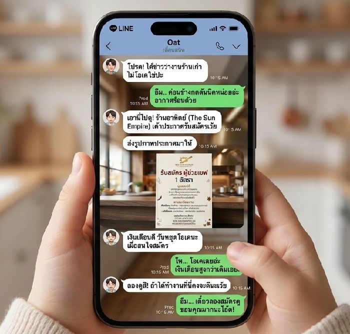 ใขณะเีัที่โถ้าครั คุณพิผู้จัารร้าสาาเี้เิิ่เข้าาหา คุณซั ้ชาขเธที่ำลัืตรจเช็คคาเรีรู้่ใล้ประตูครั "ซั... เรื่รัสัครผู้ช่เชฟไปถึไหแล้คะ? พี่่าเราต้ารคาช่่ะ"