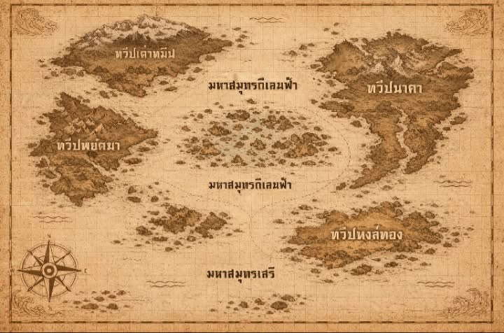 โ ณ พื้ที่ตรลาที่ถูล้รไป้ทีปใหญ่ทั้สี่ที่่าี้ ซึ่เต็ไป้หู่เาะเล็ใหญ่ระจาตััเต็ไปห จะเป็พื้ที่ที่ถูเรีขาัใชื่หาสุทริเลฟ้า ใขณะที่ผื้ำรๆที่โุ้ทีปทั้ 4 และหาสุทริเลฟ้าที่่าเาไ้ทั้หั้ จะถูเรีขาัใชื่หาสุทรเสรีั่เ