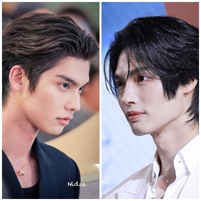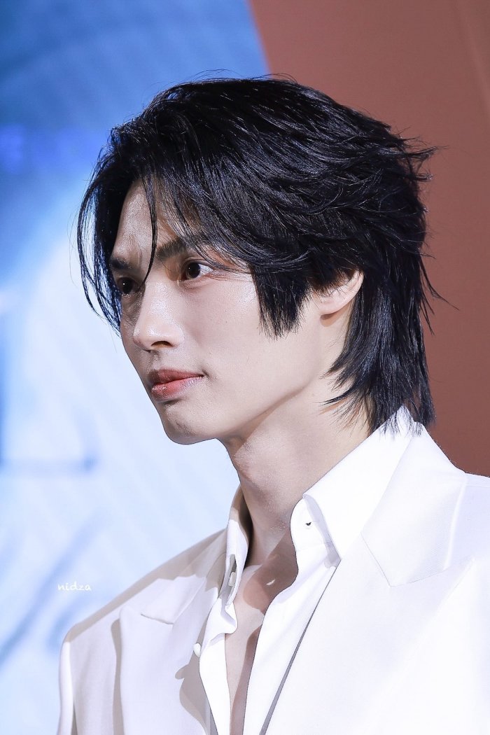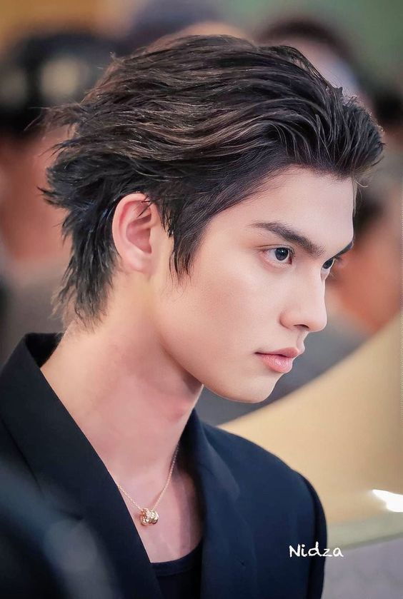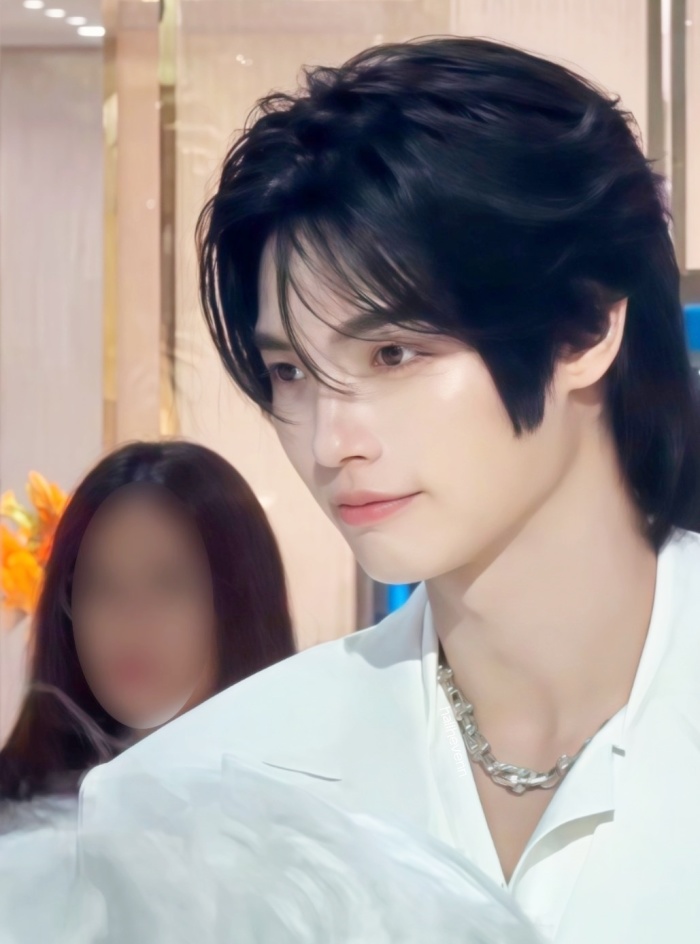ผมสีดำถูกจัดทรงเรียบร้อย ใบหน้าขาวสะอาด ดวงตาเรียวสงบนิ่งแต่แฝงความอ่อนโยน