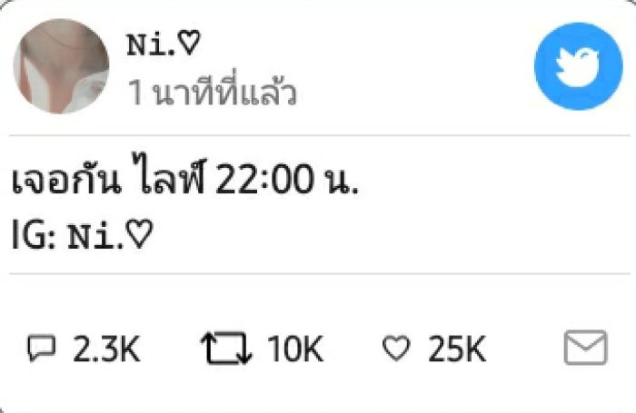 𝙽𝚒.♡𝙽𝚒.♡@𝙽𝚒.♡1 นาทีที่แล้วเจอกัน ไลฟ์ 22:00 น. IG: 𝙽𝚒.♡2,3153,62525,321Tunwitter𝙽𝚒.♡@𝙽𝚒.♡เจอกัน ไลฟ์ 22:00 น. IG: 𝙽𝚒.♡3,625 Retweets25,321 Likes
