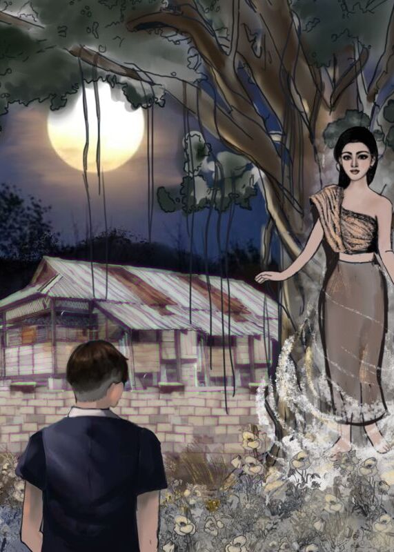ครูหนุ่มเดินไปตามทิศทางที่มีเสียงหัวเราะอย่างสดใสนั้น สองเท้าก้าวไปยังบริเวณหลังโรงเรียนที่มีสภาพคล้ายป่า ต้นไม้ใหญ่หลายสิบต้นขึ้นเรียงราย เสียงหัวเราะดังหลังต้นไม้ใหญ่ต้นหนึ่ง เขาเดินเข้าไปแล้วชะโงกหัวส่องดูหลังต้นไม้ต้นนั้น ภาพที่ปรากฏแก่สายตาทำให้ชายหนุ่มตกตะลึงจนหัวใจแทบหยุดเต้น หญิงสาวที่แทบจะเปลือยเปล่านางหนึ่งกำลังนั่งขดตัวอย่างเอียงอายอยู่ตรงโคนต้นไม้ มีเพียงใบไม้ไม่กี่ใบที่ปกปิดหน้าอกและอวัยวะเพศเอาไว้ ผิวของหล่อนขาวนวลสะท้อนกับแสงจันทร์ที่สาดต้องลงบนร่าง ใบหน้าสะสวยจนแทบบรรยายออกมาเป็นคำพูดไม่ได้