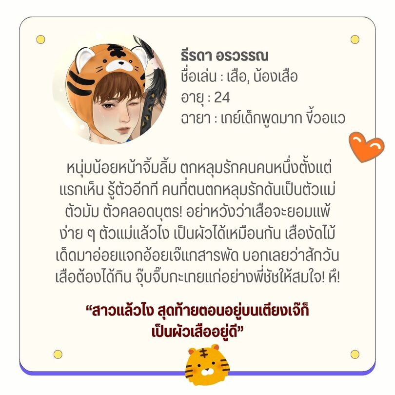 “มีแฟนยังอะ ถ้ายังไม่มี รับน้องเสือไปเป็นเมียไหม น้องเสืออยากมีผัว”