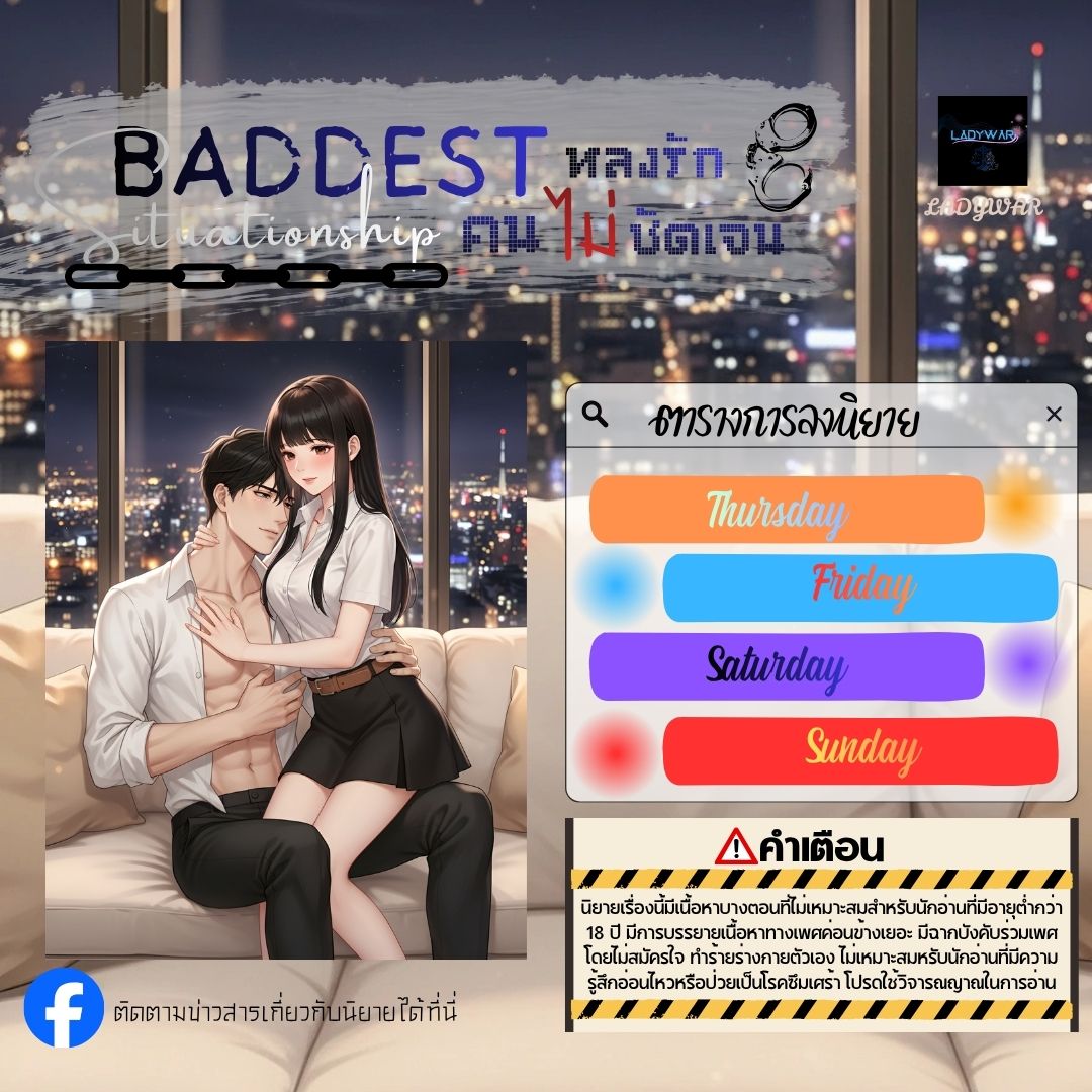 สวัสดีนักอ่านทุกท่านค่ะ BADDEST SET เดินทางมาถึงเรื่องสุดท้ายแล้วนะคะ ปิดท้ายด้วยเรื่องของความสัมพันธ์ไม่ชัดเจน เดาว่าหลายท่านคงเคยสัมผัสกับประสบการณ์ ‘ได้คุยไม่ได้คบ’ นักเขียนเลยหยิบความสัมพันธ์ยอดฮิตมาทำเป็นเรื่องนี้ ตอนแรกนางเอกจะน่าหงุดหงิดมาก อยากให้ทุกคนใช้ความอดทนแล้วเห็นใจน้องในฐานะเด็กผู้หญิงคนหนึ่งที่รักเขาหลงเขาจนหัวปักหัวปำ สปอยว่าตอนหลังพอน้องทำใจได้แล้วมาดูสภาพคนโดนทิ้งกันค่ะ บอกเลยหมาไม่แพ้เหมราชกับเพลิงกัลป์แน่นอน (ไม่นับเจเดนเพราะรายนั้นโดนน้องมิลานคุมกำเนิดด้วยมีดสุดสยิวกิ้ว) สำหรับนักอ่านหน้าใหม่สามารถอ่านแยกได้เลยไม่งงค่ะ หรือจะตามไปอ่านเรื่องเปรตๆ ของพระเอกเรื่องอื่นในเซตไรท์ก็ยินดีนะคะ