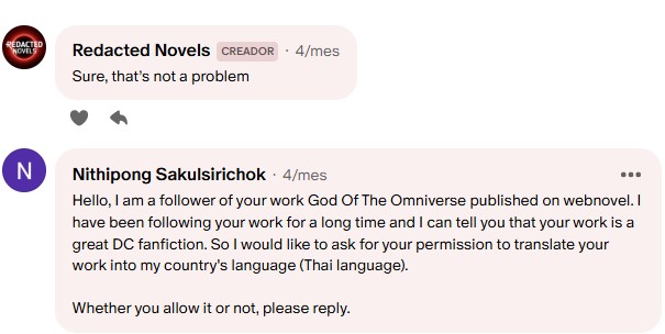 คำอณุญาติในการแปลนิยายจากเจ้าของผลงาน
