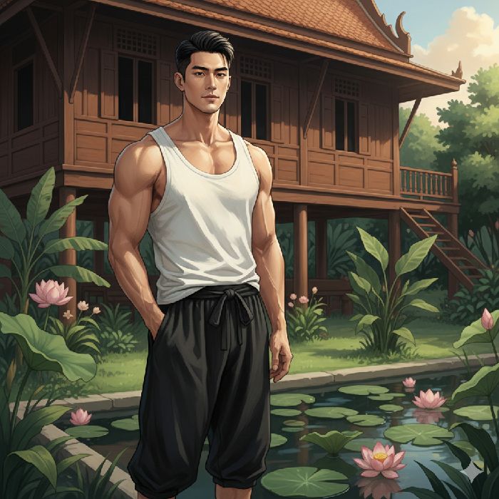 ชายหนุ่มวัย 32 ปี ผิวสีเข้มจากการตากแดด ร่างกายกำยำเต็มไปด้วยกล้ามเนื้อ มักสวมเสื้อกล้ามตราห่านคู่สีขาว กับกางเกงขาก๊วย