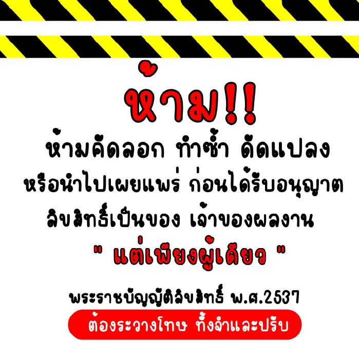 เนื้อหานิยายเรื่องนี้ขอสงวนลิขสิทธิ์ตามพระราชบัญญัติลิขสิทธิ์ พ.ศ. 2537 และฉบับเพิ่มเติม ไม่อนุญาตให้ทำซ้ำ ดัดแปลง คัดลอก แก้ไขหรือสแกนเนื้อหาส่วนใดส่วนหนึ่งของนิยายเรื่องนี้ เพื่อสร้างฐานข้อมูลอิเล็กทรอนิกส์ เว้นแต่ได้รับอนุญาตเป็นลายลักษณ์อักษรจากเจ้าของลิขสิทธิ์แล้วเท่านั้น